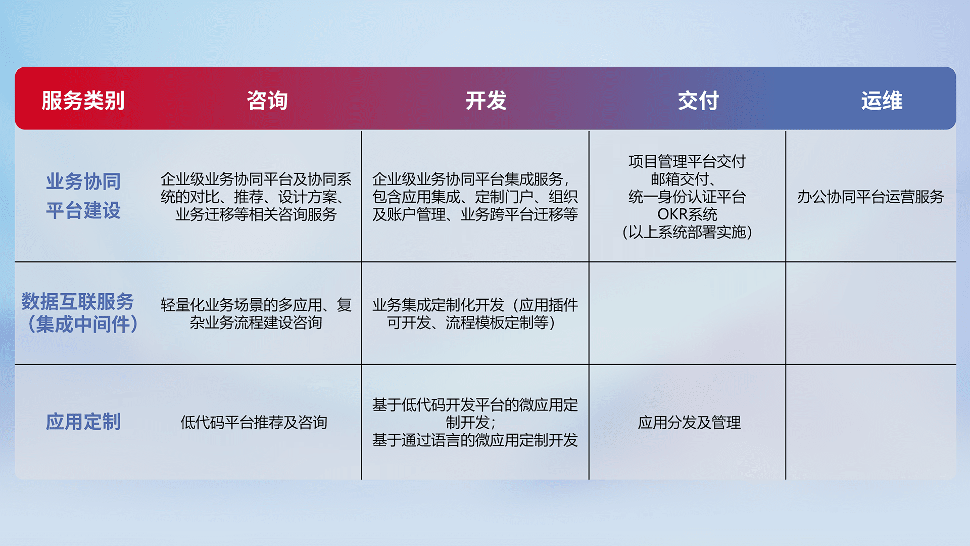 针对钉钉、、、企微、、IDaas等平台级产品提供产品的规划、、方案、、、、交付、、、、定制化开发等服务,,,,实现如统一协同办公、、、智能客户服务、、、、混合会议管理、、、、智能数据查询、、、等业务场景,,,实现数字化转型。。